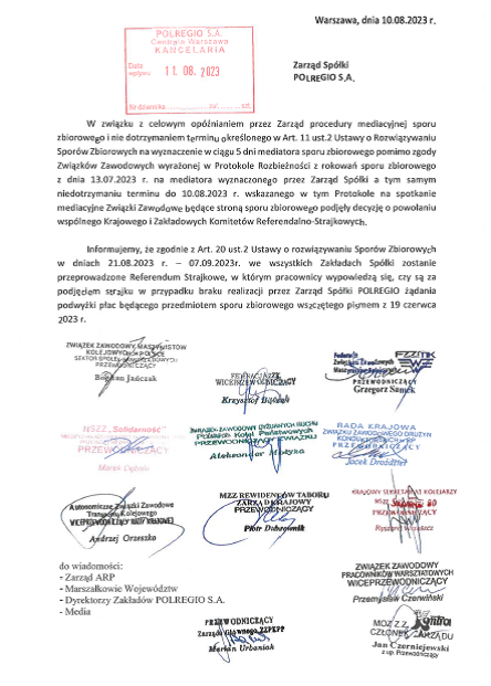 Pismo strony związkowej do zarządu POLREGIO S.A. o powołaniu Krajowego i Zakładowych Komitetów Referendalno-Strajkowych
