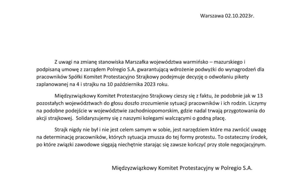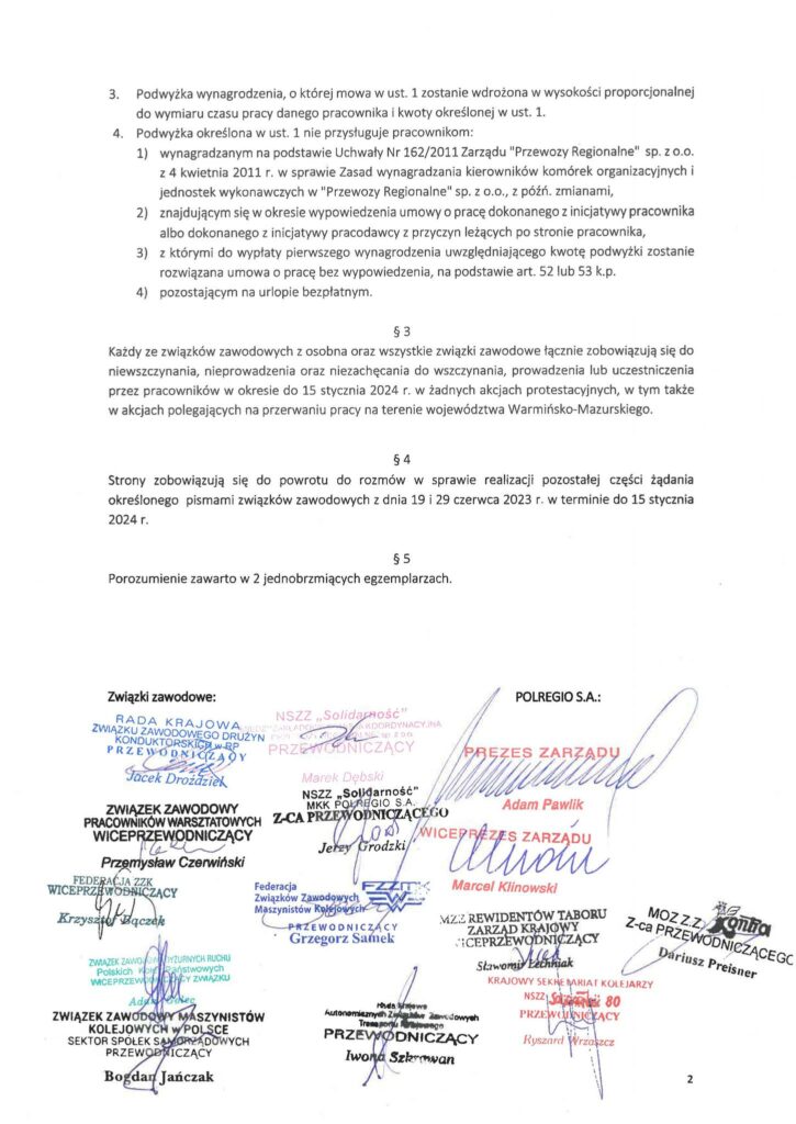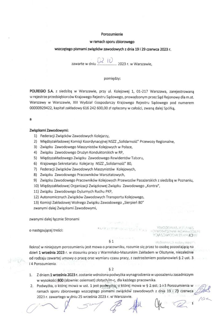 Porozumienie płacowe w spółce POLREGIO S.A. dotyczące warmińsko-mazurskiego Zakładu w Olsztynie
