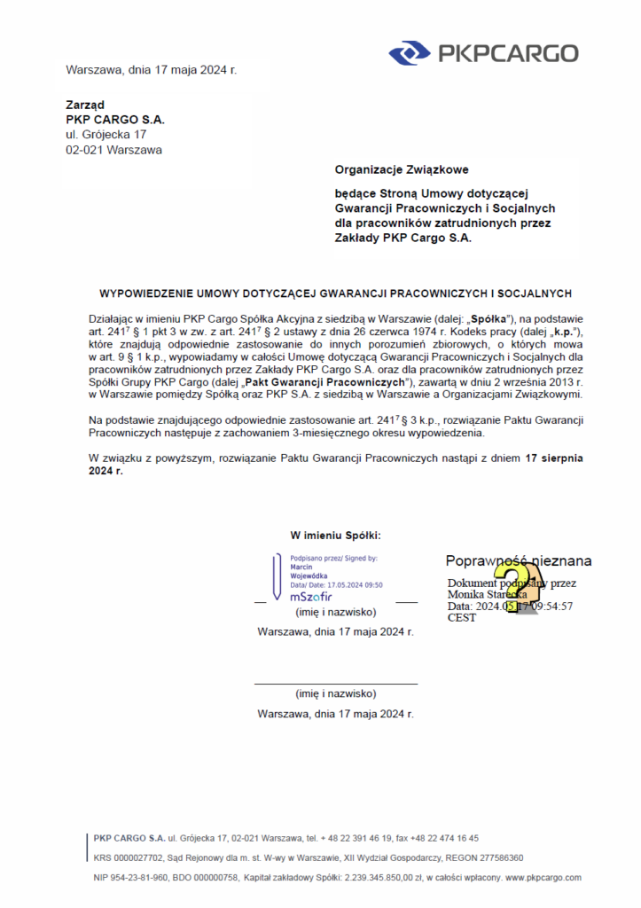 Pismo zarządu PKP CARGO S.A. w sprawie wypowiedzenia umowy dotyczącej gwarancji pracowniczych i socjalnych dla pracowników zatrudnionych w spółce PKP CARGO i w spółkach Grupy PKP CARGO.