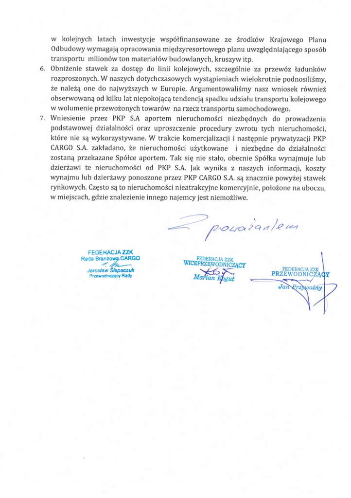 Pismo Federacji ZZK do sejmowej Podkomisji stałej ds. transportu kolejowego w sprawie naprawy PKP CARGO S.A.