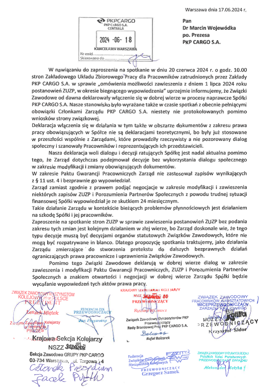 Pismo organizacji związkowych w odpowiedzi na propozycję zarządu PKP CARGO S.A. dotyczącą zawieszenia postanowień ZUZP w trakcie biegnącego wypowiedzenia