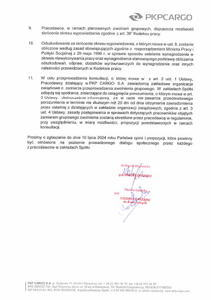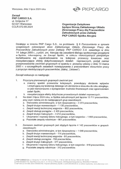 Pismo zarządu PKP CARGO S.A. do organizacji związkowych o podjęciu zamiaru przeprowadzenia w spółce zwolnień grupowych
