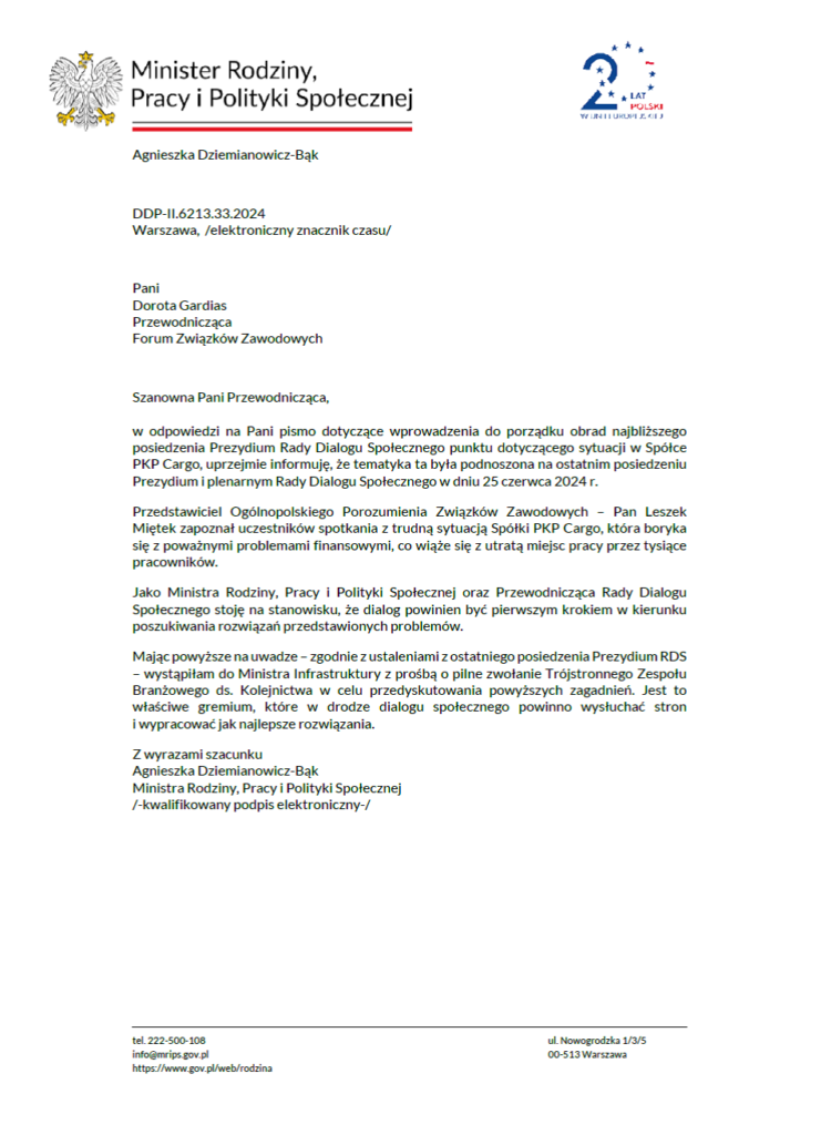 Odpowiedź ministry rodziny, pracy i polityki społecznej na pismo przewodniczącej FZZ o uzupełnienie porządku obrad Prezydium RDS o punkt dotyczący sytuacji w PKP CARGO S.A.