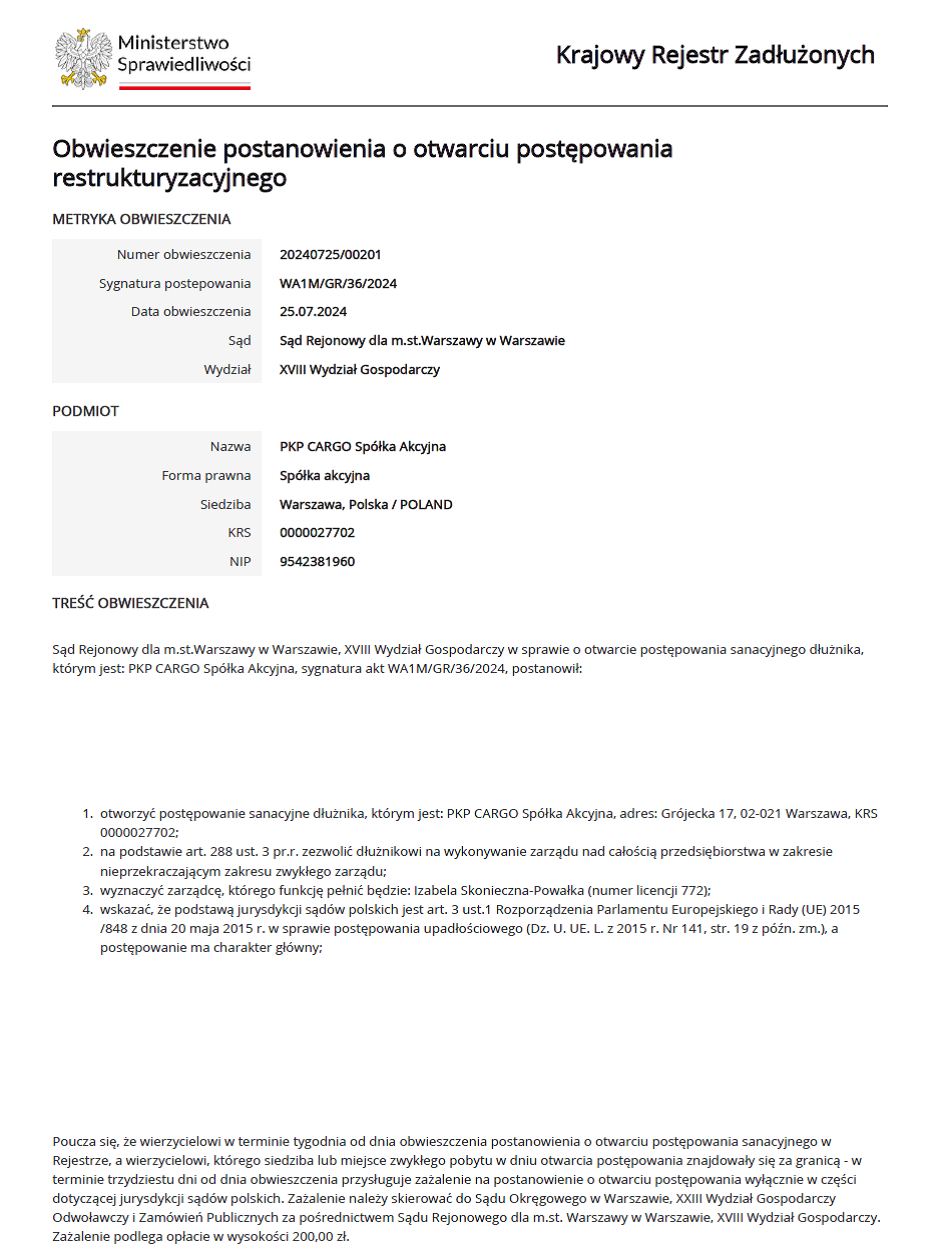 Obwieszczenie postanowienia o otwarciu postępowania restrukturyzacyjnego wobec PKP CARGO S.A.